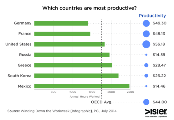 And more hours worked does not mean organizations are gaining more productivity. The OECD looked at productivity compared to hours worked per week, and Germany and France — countries with more generous vacations and shorter work weeks — achieve higher rates of output than countries working longer hours.