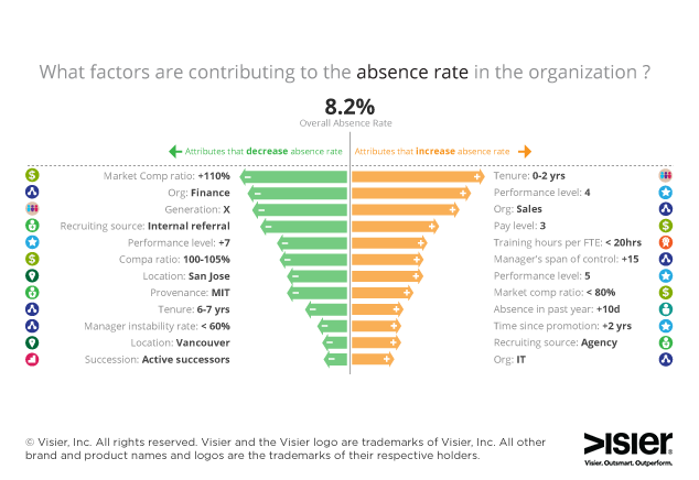 Use workforce analytics to determine which locations, departments or teams have the highest rates of absence per employee and highest resignation rates. Also investigate these other data points, as they can reveal more information on an employee’s risk level: