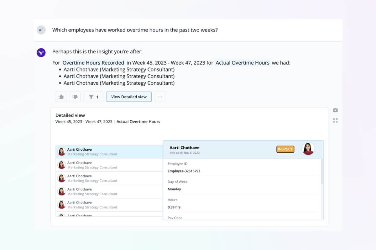 Vee is a digital assistant with no learning curve that can answer all your people- and team-related questions. It has a user-friendly interface and simplifies access to the data so that even those with little knowledge of AI and analytics can start using it immediately.