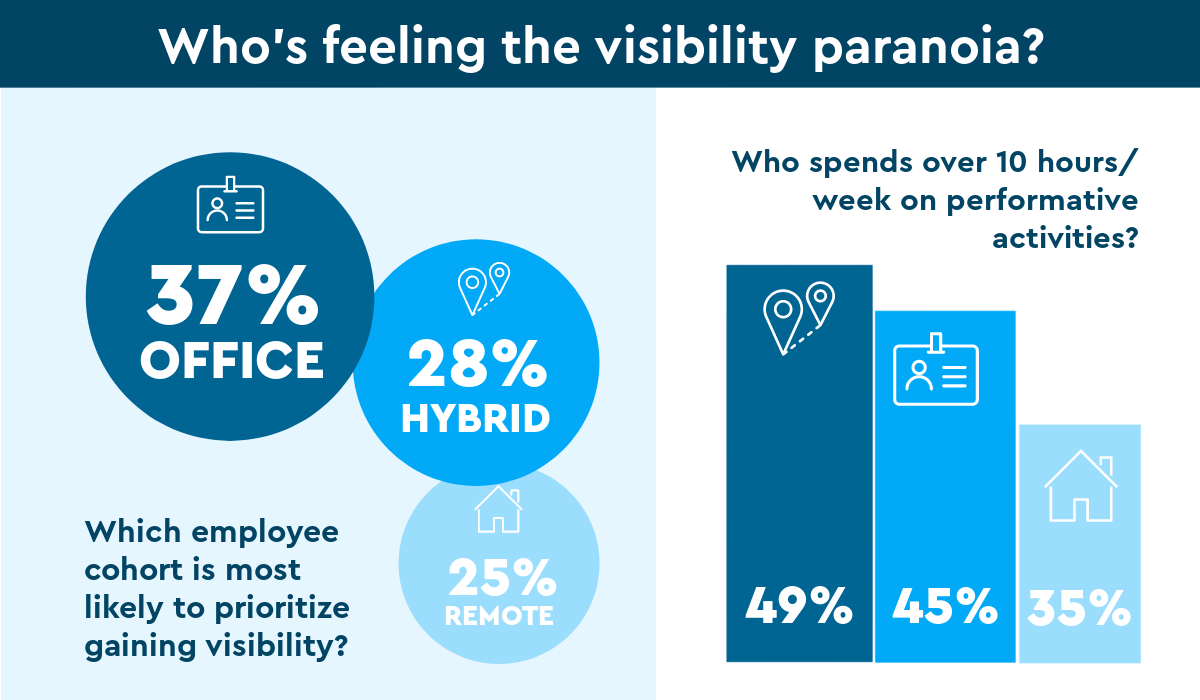 Clearly, visibility plays a major role in how and why employees go about their day. But what about performative work behaviors specifically? Why do 83% of respondents engage in these types of tasks for several hours (or even days) per week?