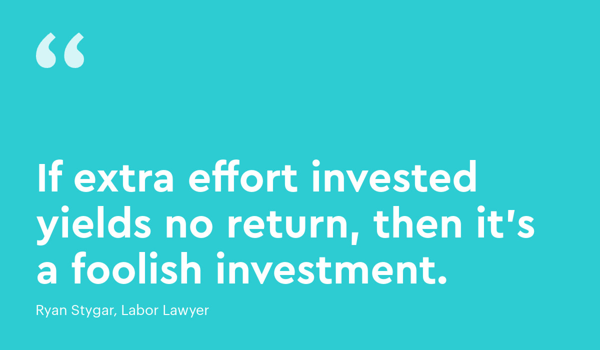 Labor lawyer Ryan Stygar in San Diego, CA isn’t surprised to see this happening. “It’s a logical move by workers. They work for income. If extra effort yields no extra income, then eventually they cease to invest that extra effort at work. It can be frustrating for managers, but they need to recognize that employees are simply reacting to the employer’s own effort/reward systems. If those systems are yielding unwanted outcomes, then they need to be changed.” Putting in more than what’s strictly required can also lead to burnout.
