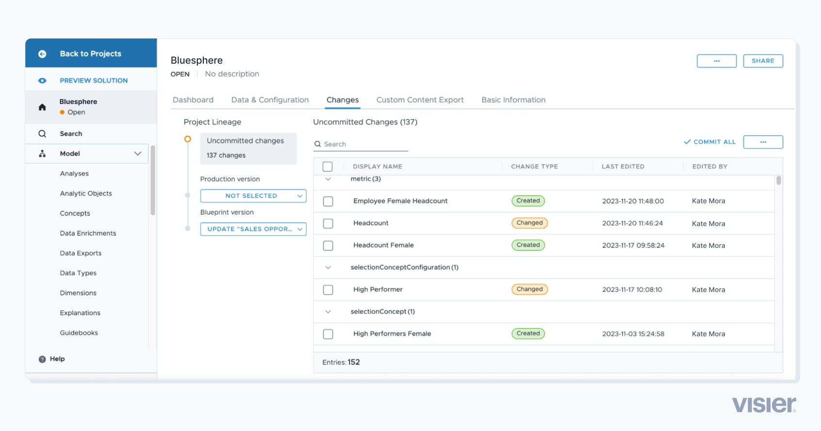 Visier makes managing a customer’s development lifecycle simple with projects. The list of changes in a project is tracked by the platform’s version control, enabling admins to determine what gets merged into production. Studio includes built-in approval workflows, editing, change status updates, and collaboration capabilities based on user permissions. Based on user privileges, any changes can be submitted for approval or released into production.