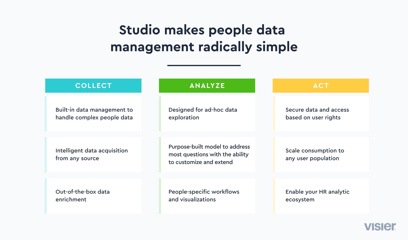 What is Visier's Studio environment?Common data challenges the studio environment solvesSetting up users and permissionsHow to configure security settingsHow the studio environment helps you manage your dataHow to manage projects in the studio environmentHow new functionality is added to the platformEfficiently manage people analytics deliveryIn this post, we’ll explain the benefits of using Visier’s in-app interface, also called Studio, to run the entire lifecycle management process for Visier People®. Read on to learn more about the studio environment and how administrators can use it to efficiently manage people analytics delivery without downtime or disruptions.