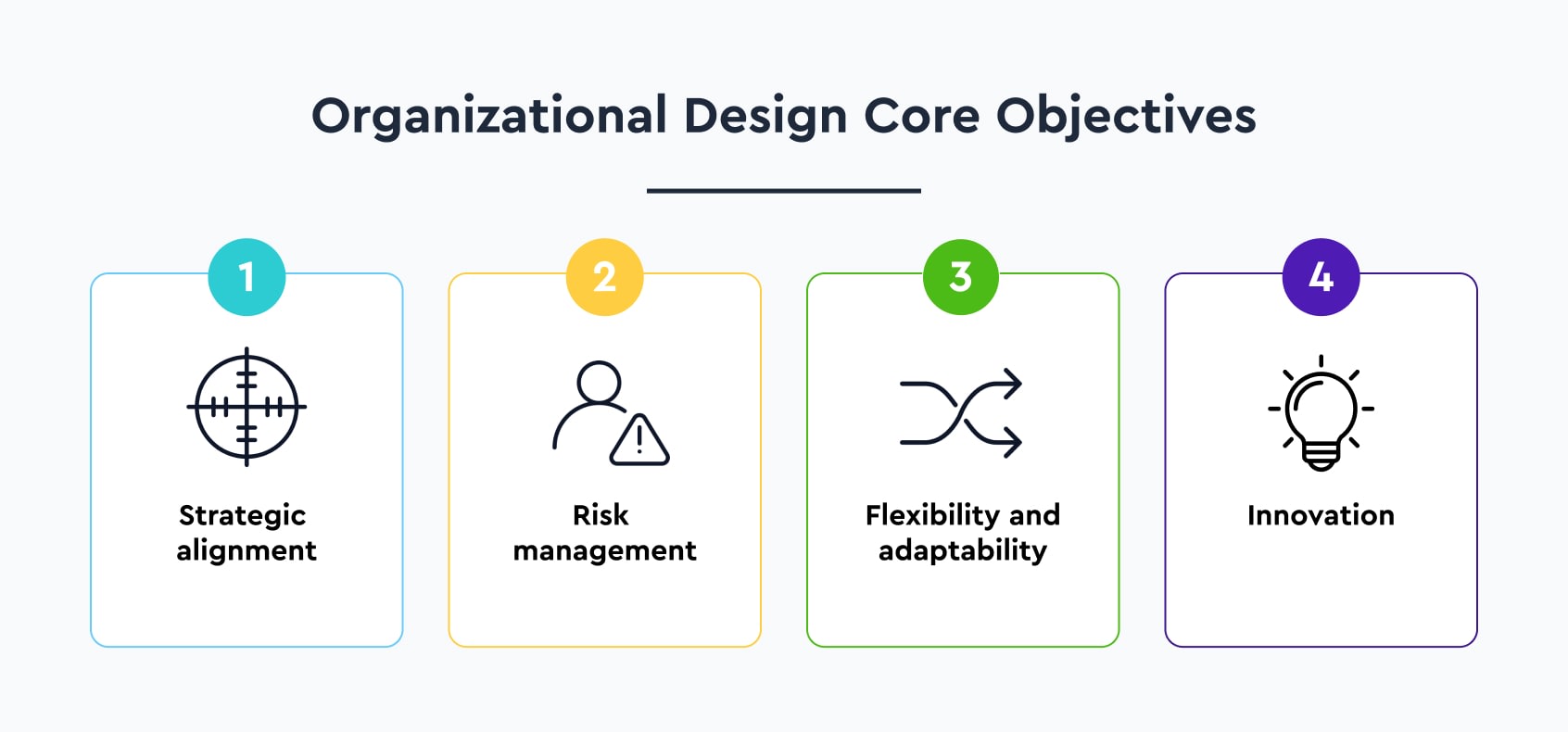 The primary goal of organizational design is to create a framework that enables companies to achieve their goals efficiently by helping to improve communication, productivity, and innovation amongst employees. It helps you align your business strategy with various internal components, such as people, tasks, and processes.