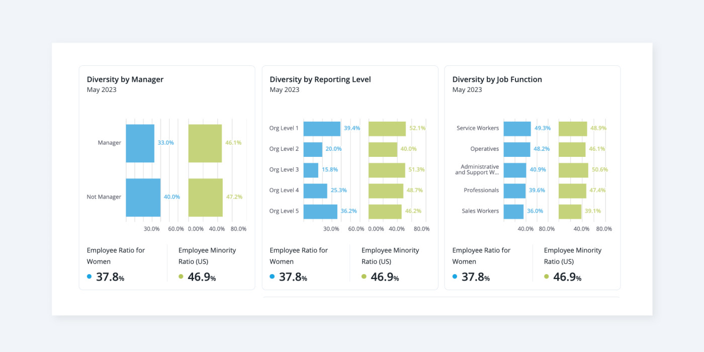 A diversity dashboard will usually contain many of the core HR metrics, like headcount and compensation metrics, shown in a DEIB lens. For example, you’ll be able to see turnover rates for different genders, races, or ethnicities. Or, look at promotion metrics. Does everyone have equal opportunities or is one gender getting all the promotions?