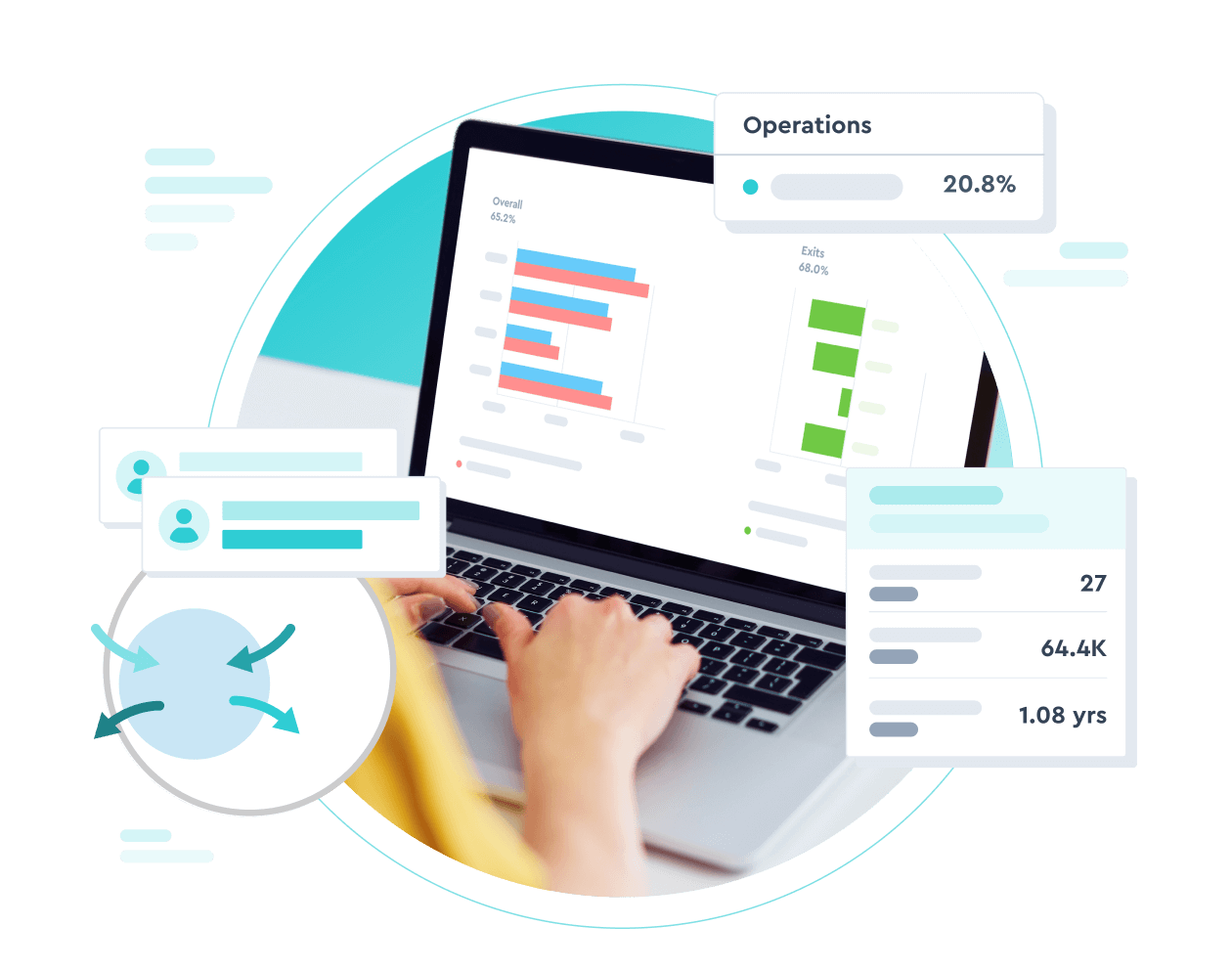 People analytics dashboards help you compile all the data you need to see in a meaningful way, quickly and easily. With people analytics dashboards, you can keep an eye on employee satisfaction and employee engagement to make proactive decisions when problems arise, and evaluate the likelihood of employee turnover and its underlying causes. Use people analytics dashboards to look at internal staff movement more holistically by illustrating the number of new hires, exits, and internal transfers all in one central location.