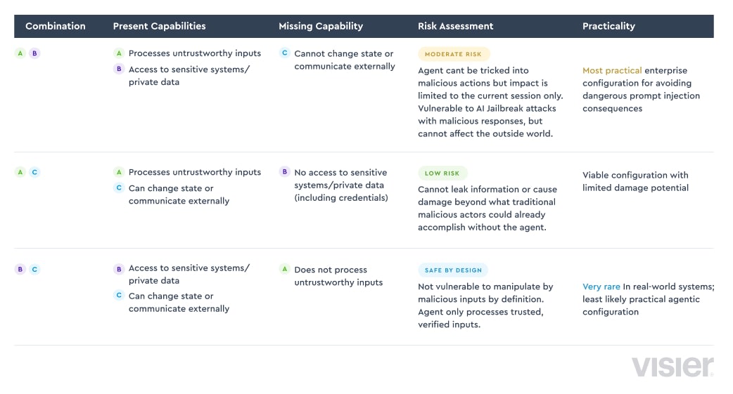 However, an agentic system that can’t ever be exposed to untrustworthy inputs (combination BC) offers very little practical benefit in automating workflows and navigating enterprise knowledge and information. That leaves only combination AB as the most reasonable option to limit negative consequences while retaining the power of agents.