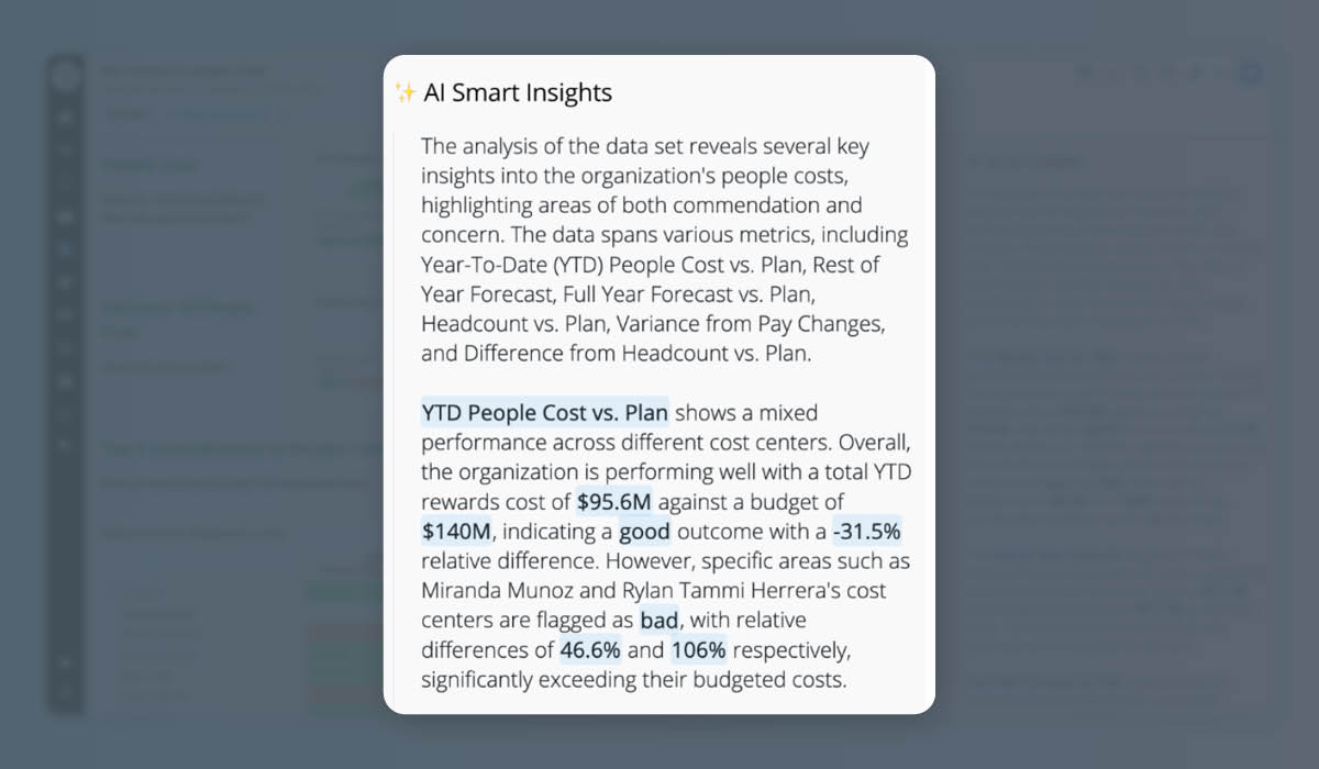 AI summaries are table stakes these days. The Smart Insights pane within Vee Boards is more than just a recap of the data in narrative format. It does what a human analyst would do: