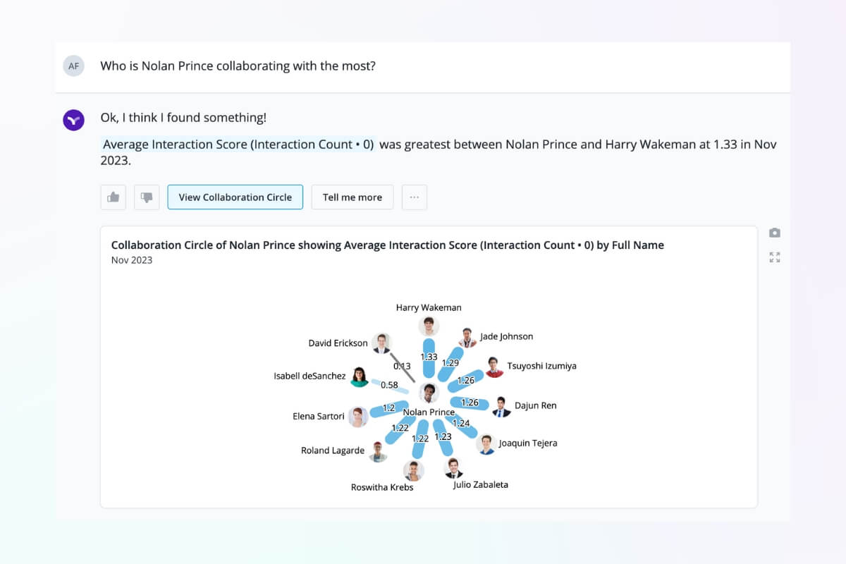 Next, we’ll offer 10 specific questions that managers can ask Vee—questions that can give them insights into people operations to help improve productivity, collaboration, retention, and more—and show real examples of how Vee would answer.