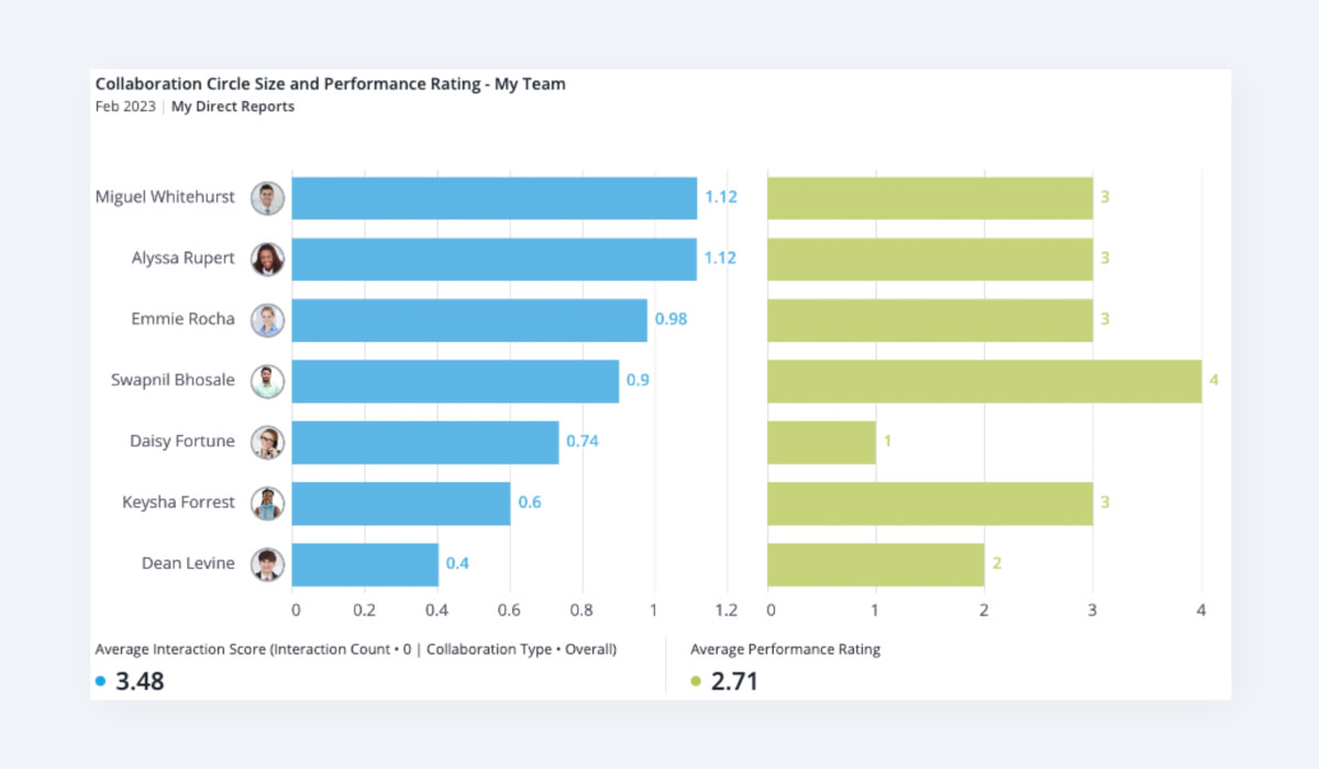 Workplace Dynamics uses passive listening to understand how and with whom employees collaborate, how they feel, and how they get work done. This is then combined with actively solicited employee feedback, including strengths and weaknesses of team members with whom employees are working closely, to provide the most complete view of employee collaboration, well-being, and productivity.