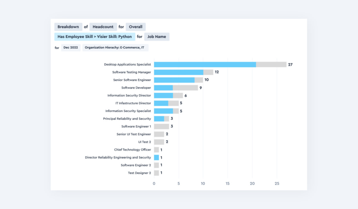 Visier People Skills Intelligence Engine provides an advanced jobs and skills ontology with over 3,000 occupations (for employees and requisitions), 15M+ job titles, 14,000+ standardized skills, across 27 industries and 27 different languages. It also provides insights into the automatability and remote workability of skills, so you can make better decisions about recruiting, retention, compensation, and remote work.