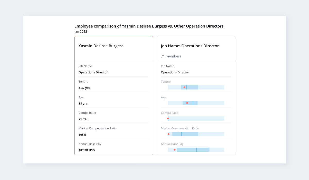The following example compares an employee, Yasmin Burgess, an Operations Director, to peers. We can see that while she is in the mid-range for age and tenure as others in that job, she is below market compensation ratio range and below range on annual base pay. Depending on other factors such as performance, potential and risk of exit, it may be worth considering a pay adjustment.