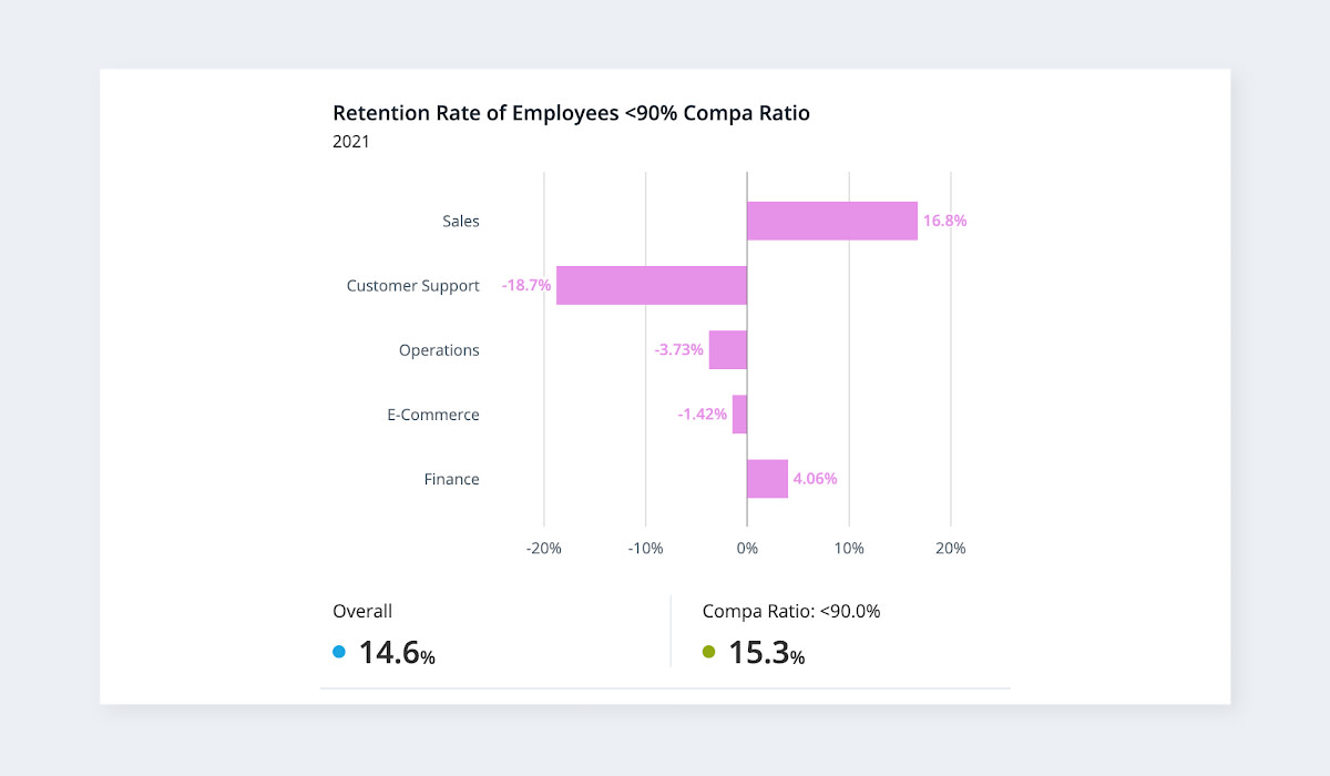 The following chart illustrates retention rates for employees earning below the 90% compa ratio (10% below the salary midpoint) in different departments of an organization. We can see that employees in Customer Support were more likely to leave than employees in Sales indicating they may be more sensitive to pay.