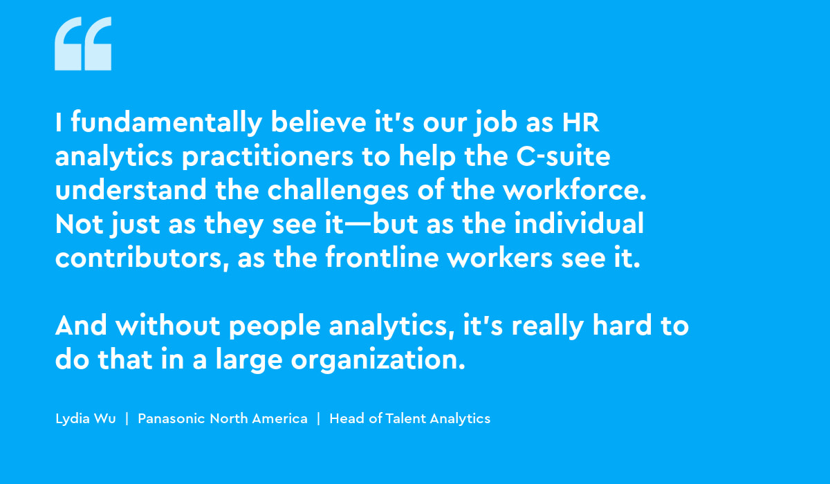 I think people analytics data can support the C-suite in creating a data-driven organization by shining the spotlight on some really hard conversations that have been typically ignored in organizations. Going back to my original point, I always tell my team, “It’s not a good month if I don’t feel like I’m about to lose my job going into a decision-making meeting or a presentation.” Because I fundamentally believe it’s our job as HR analytics practitioners to help the C-suite understand the challenges of the workforce. Not just as they see it—but as the individual contributors, as the frontline workers see it. And without people analytics, it’s really hard to do that in a large organization.
