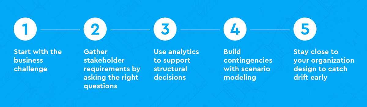 In addition to leveraging best-in-class tooling to help wrangle data and ensure the right decisions are being made against business strategy, here are five key steps to a business forward strategic organization design process: