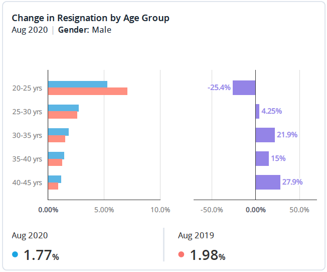 The chart below breaks down the change in resignation rates by age group from August 2019 to August 2020. All except the 20-25 age group experienced an increase in resignations during this time.