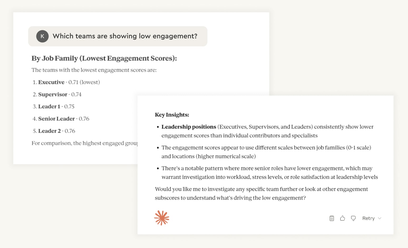 A CHRO using Claude, asks: “Which teams are showing low engagement?”. The agent connects to Visier’s MCP Server to retrieve the real-time metric from Visier’s governed model, helping leaders spot cost issues immediately and respond without waiting for IT support. The resulting impact means decisions can happen in hours instead of days, and manual reporting is dramatically reduced.
