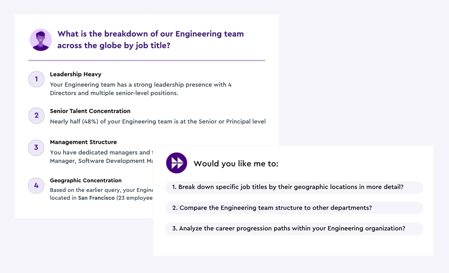 The AI agent retrieves the answers directly from Visier’s standardized data model, ensuring consistency across all systems and workflows.