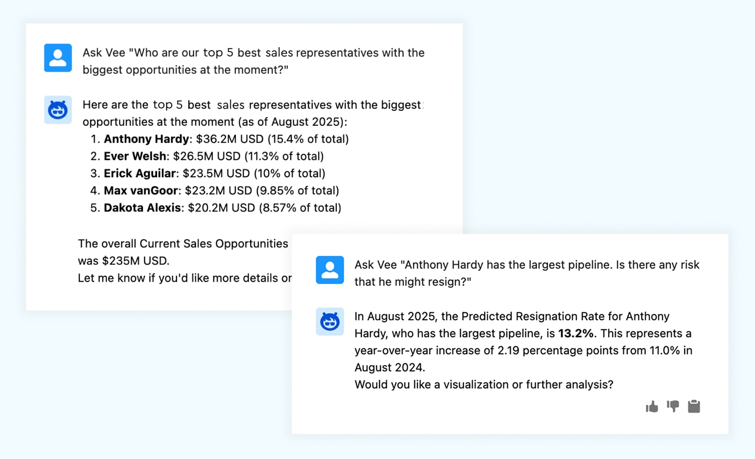 A sales manager uses Agentforce with Visier MCP to connect HR and sales data, identifying top performers driving pipeline growth and those at risk of leaving. With calendar integration, the agent highlights upcoming meetings to proactively address retention and revenue risks. This unified insight helps leaders protect key accounts while improving engagement and performance across the sales team.