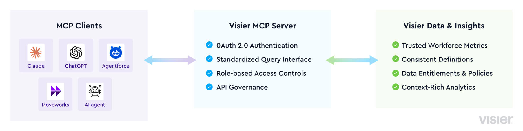 For HR and business leaders: it brings Visier’s workforce intelligence directly into their AI tools, ensuring every answer is consistent, compliant, and contextually-aware.
