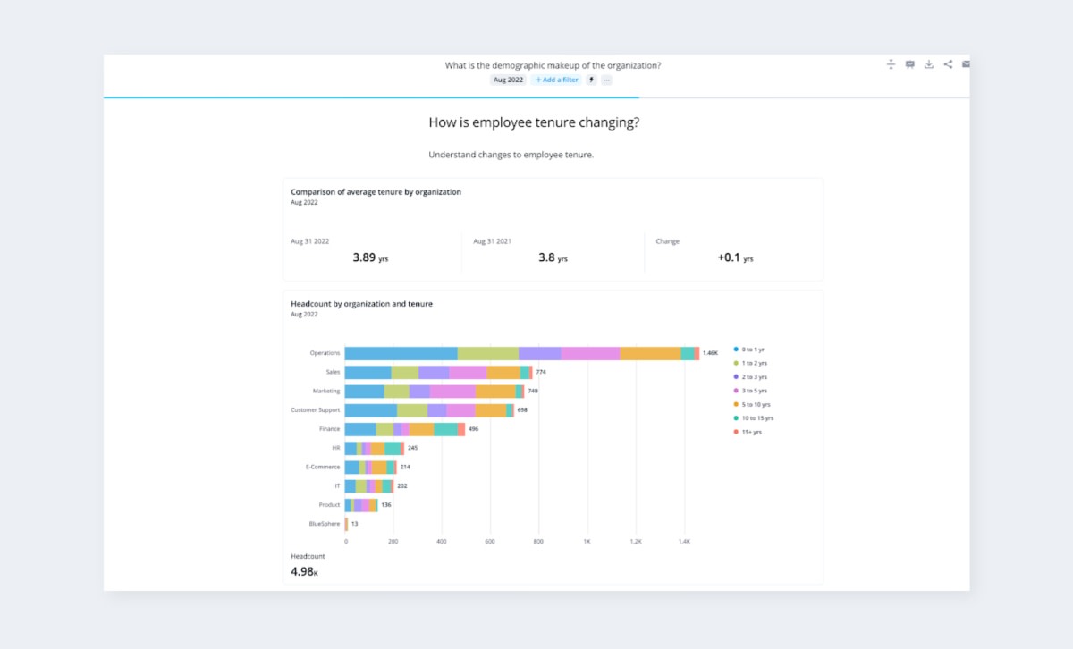 Like with all other dashboards, this one can also be adapted to your needs. View more or fewer data points regarding demographics and compare it to other metrics such as compensation or turnover rates.