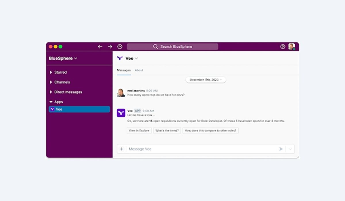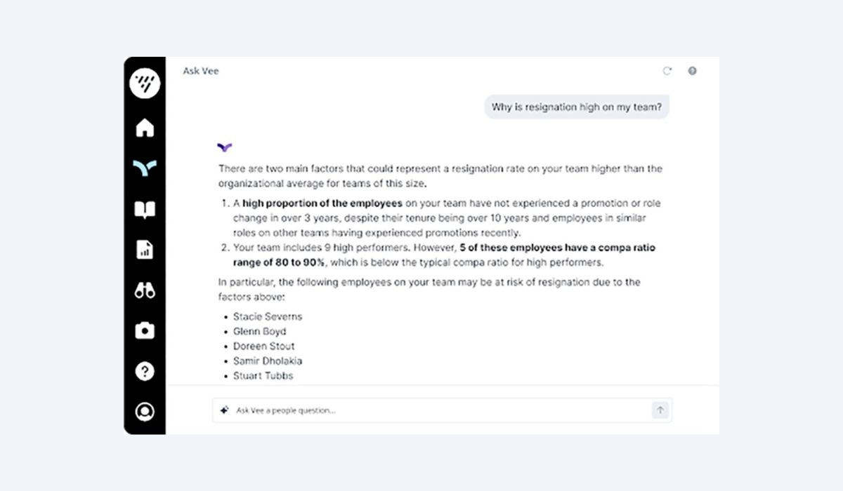“Vee is the future. It’s a game changer for the less tech-savvy to access insights—like managers who can ask a simple question about their turnover and get back an immediate answer instead of coming to the people analytics team.”