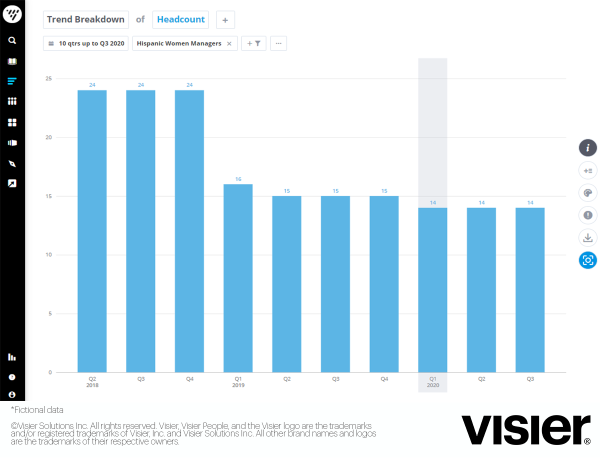 Analyzing diversity measures, such as minority ratios by supervisor or promotion rates for female individual contributors, has been a core capability in the Visier platform for over six years. We are proud of the amount of change that has been achieved through the use of our application. A study to be released in October found that organizations who use Visier have substantially increased the rate at which women are moving into management roles.