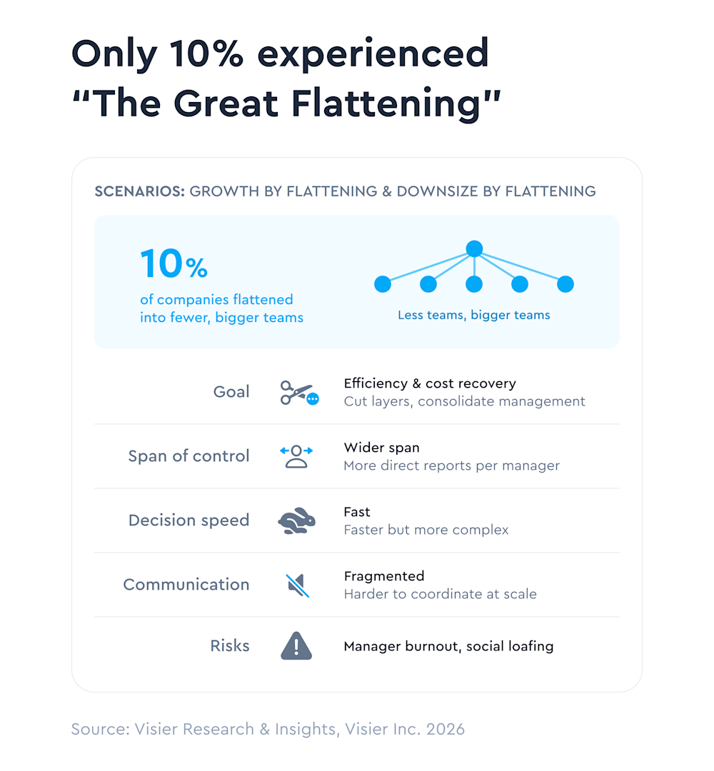 But what really surprised us was in relation to the “Great Flattening Trend.” This is the trend of eliminating middle managers through team consolidation, which results in larger teams and wider spans of control for remaining managers.