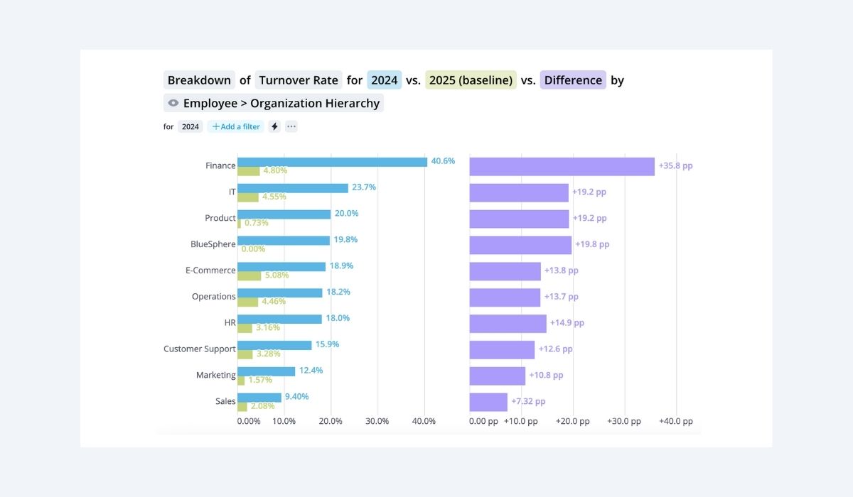The insight comes when you can see that employees who have participated in the new onboarding training have a lower rate of turnover; therefore, it may be worth expanding the pilot across the organization. With this insight, you can make the business case for the program to your leadership.