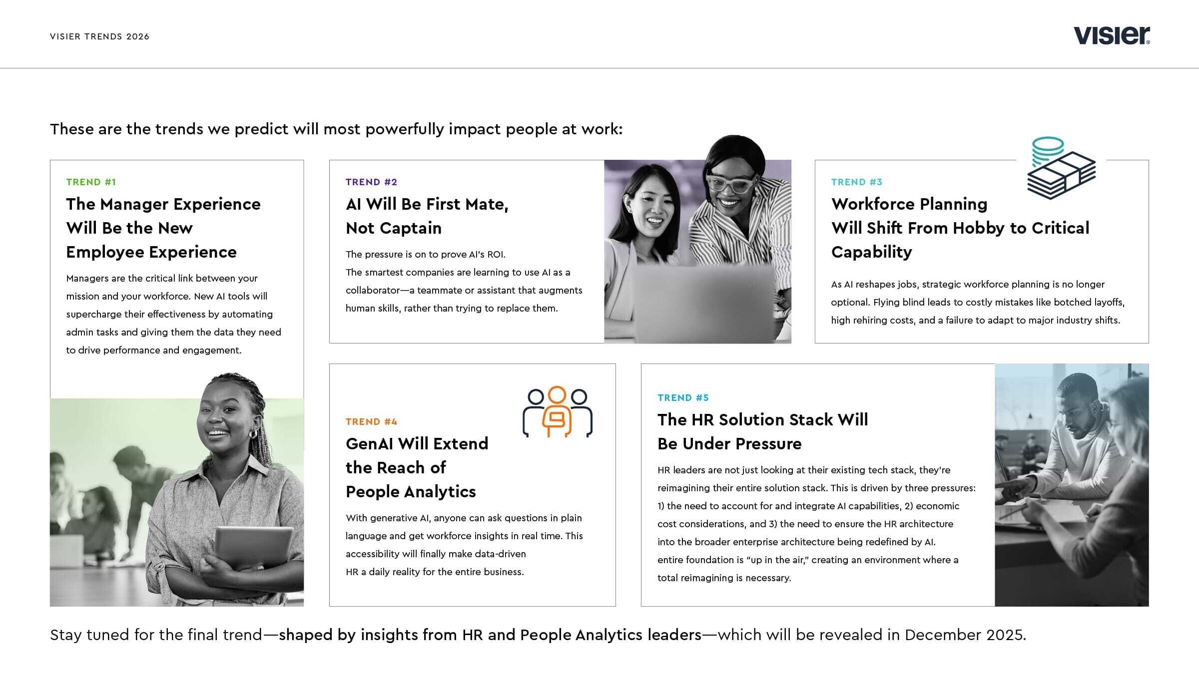 VANCOUVER, BC, Nov. 13, 2025 /PRNewswire/ -- Visier, the globally recognized leader in Workforce Intelligence and AI solutions, today released its anticipated report Trends 2026: The Business Case for Humans in the AI Era, revealing the five defining trends CHROs need to pay attention to that will shape how organizations lead, plan, and thrive in the age of artificial intelligence.