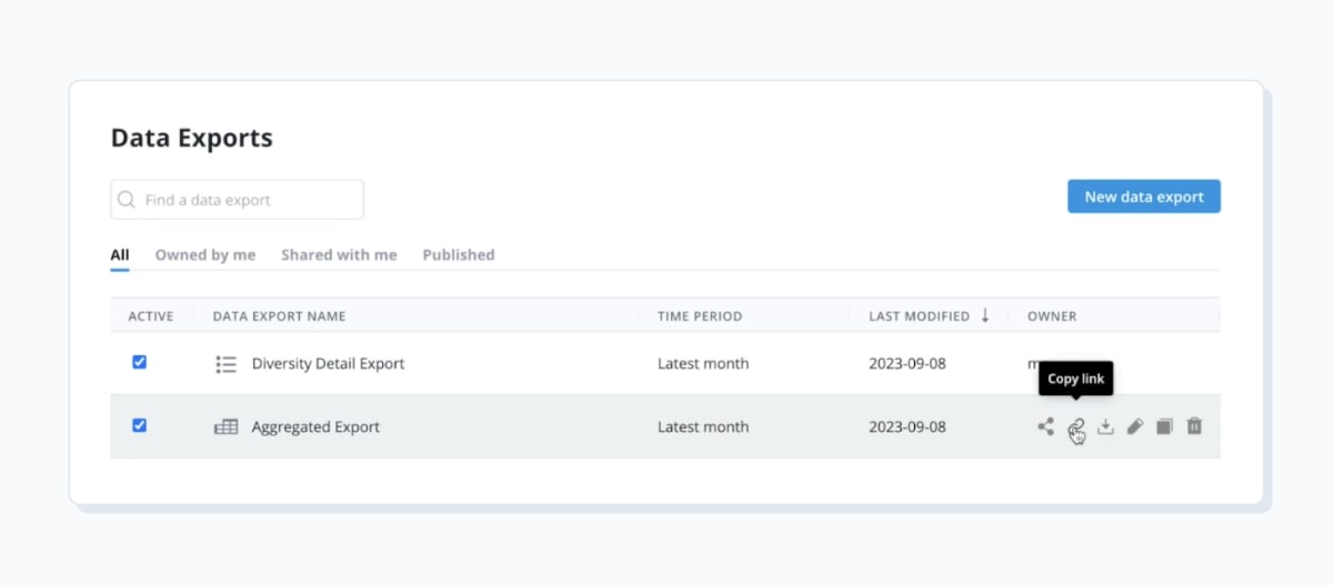 Creating a Data Export is as simple as going into Studio, Visier’s administration environment, and navigating to the Data Export room where you can define your data table (rows and columns), filters, and your time period (which can be trailing). From there, preview your data and generate a unique secure link, which provides access to your Data Export.