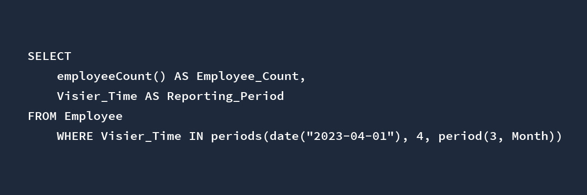 Here’s an example of a SQL-like query in Visier, querying Headcount for four 3-month periods starting from April 1, 2023:
