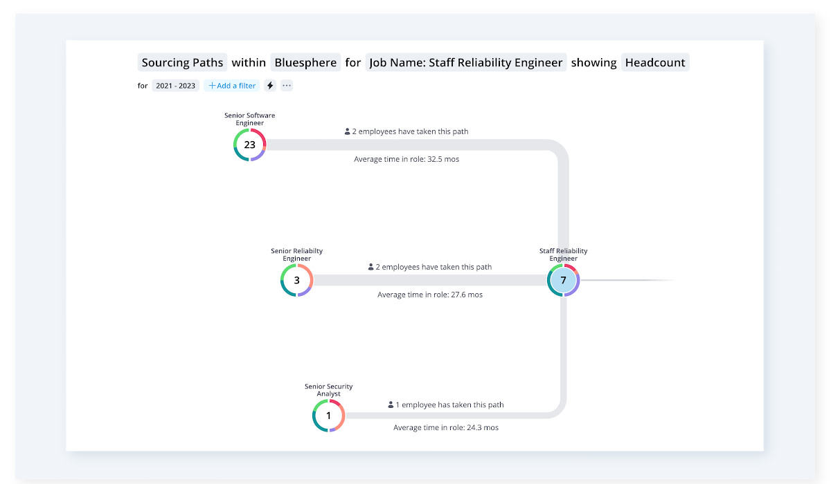 If you’re trying to elevate your internal recruiting game, Sourcing Paths show your best internal candidates for vacant roles. These let you choose a specific job target and observe the predominant routes employees took to reach that position. You can also use this tool for succession planning, internal skill development, or simply to source new roles.