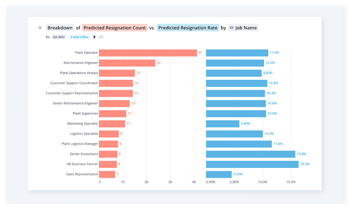 Breakdown chart showing an organization's predicted resignation count vs. the predicted resignation rate