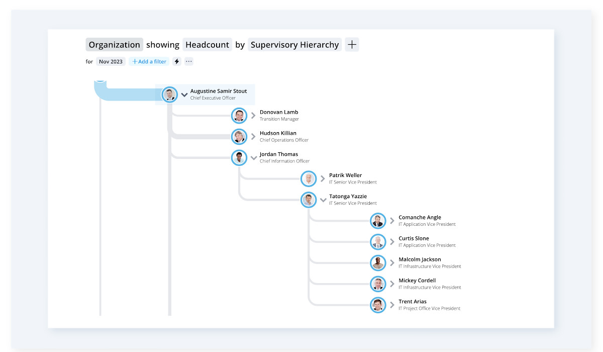 This visual is handy if you want to get a broader perspective on the entire organization. You can do so by exploring the organization's chain of command and gaining more details into the various metrics that impact it.