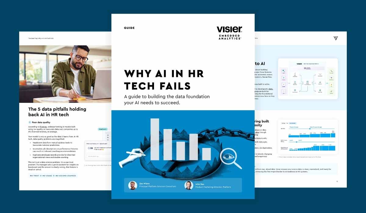In this guide, Zac Wiens and John Rau explain why so many AI projects fail in HR tech, outline the specific data challenges vendors face, and provide a practical framework for making your workforce data AI-ready. Drawing on Visier’s 10+ years experience of working with 65,000+ customers, this guide breaks down the hidden data gaps that kill AI projects and shows you how to fix them.