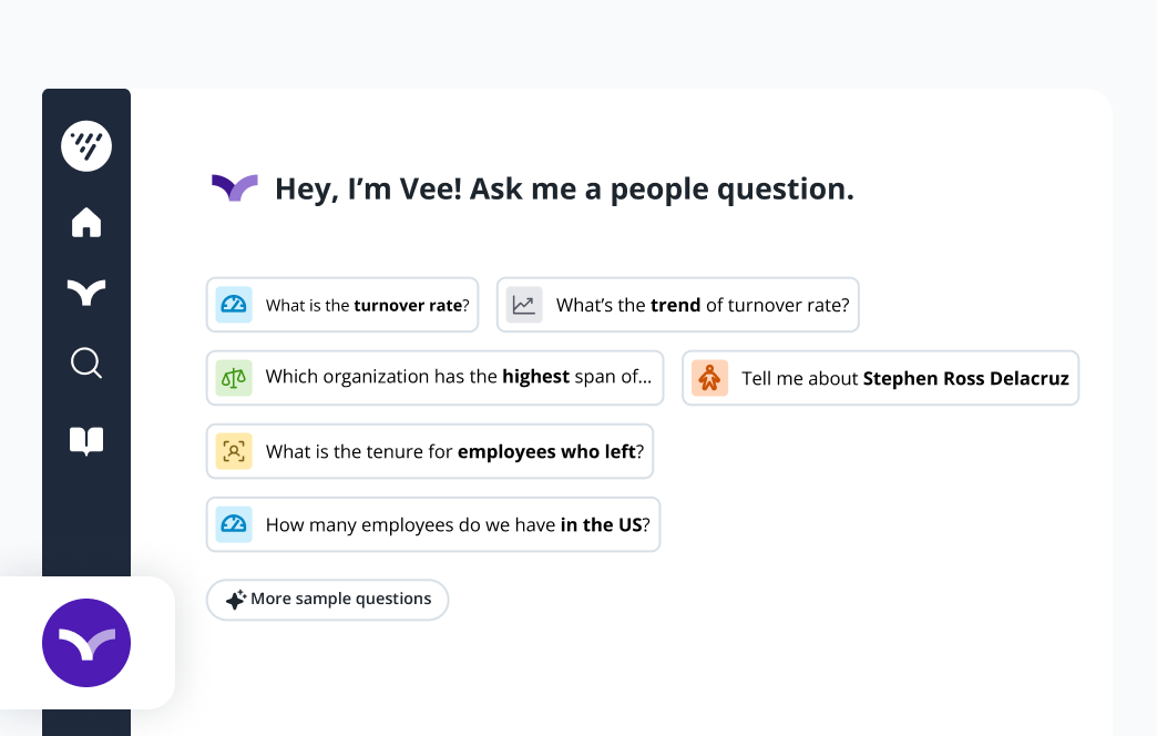 Vee, purpose-built for HR, instantly delivers AI-powered workforce insights. Vee helps CHROs, HR teams, and people leaders guide daily decisions and drive business productivity.