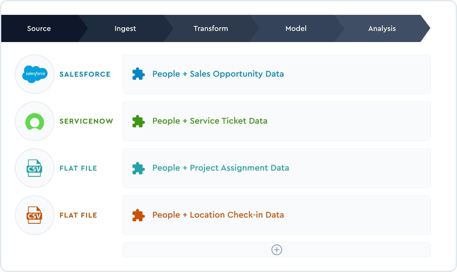 Visier Extensions help you build faster with lean models and metrics for analyses that include Employee Goals, Case Management, Location Check-ins, Project Assignments, and more. Some use cases include connectors like Salesforce and ServiceNow.