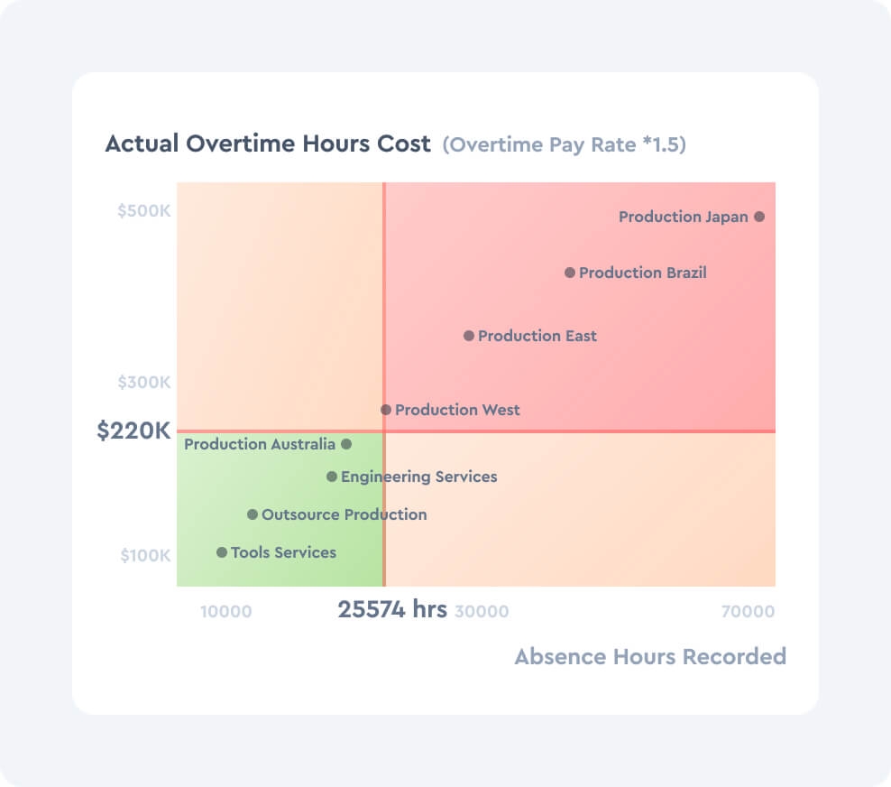 Overtime, absenteeism, and leave time need to be carefully managed so they don’t cause cost overruns or business disruption. Use Visier to understand the root causes of challenges in these areas, and to identify specific changes needed.