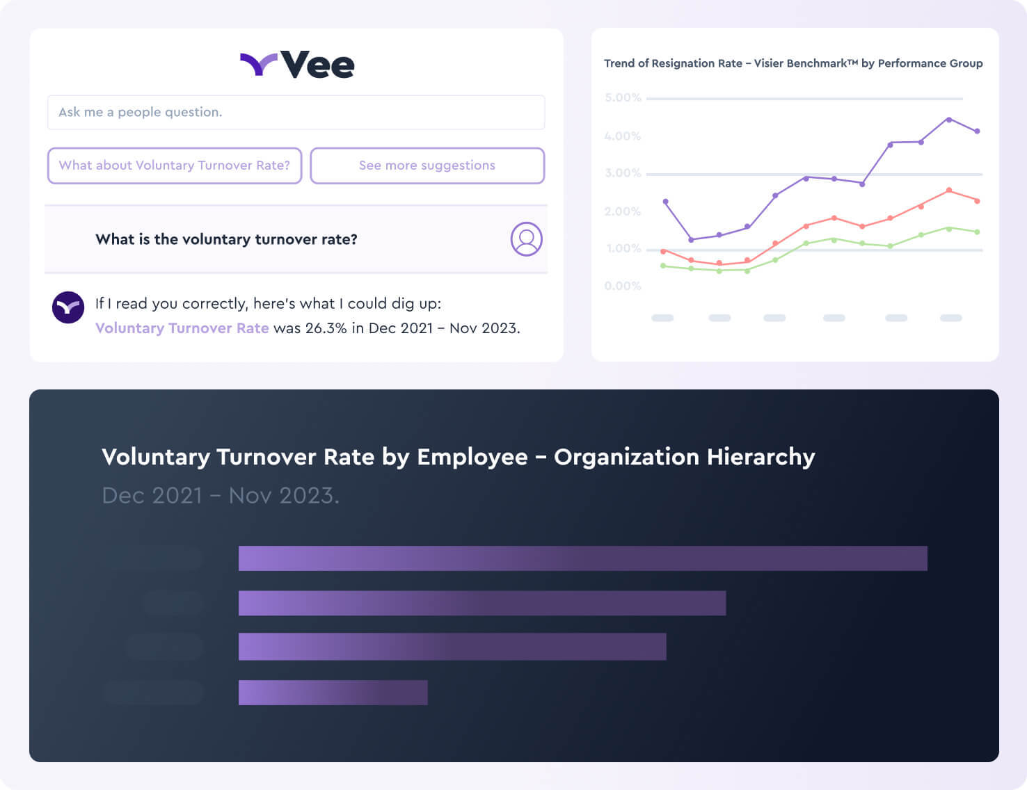 With Vee, Visier’s AI-powered digital assistant, any user can ask business-critical workforce questions in natural language and receive instant, accurate answers.